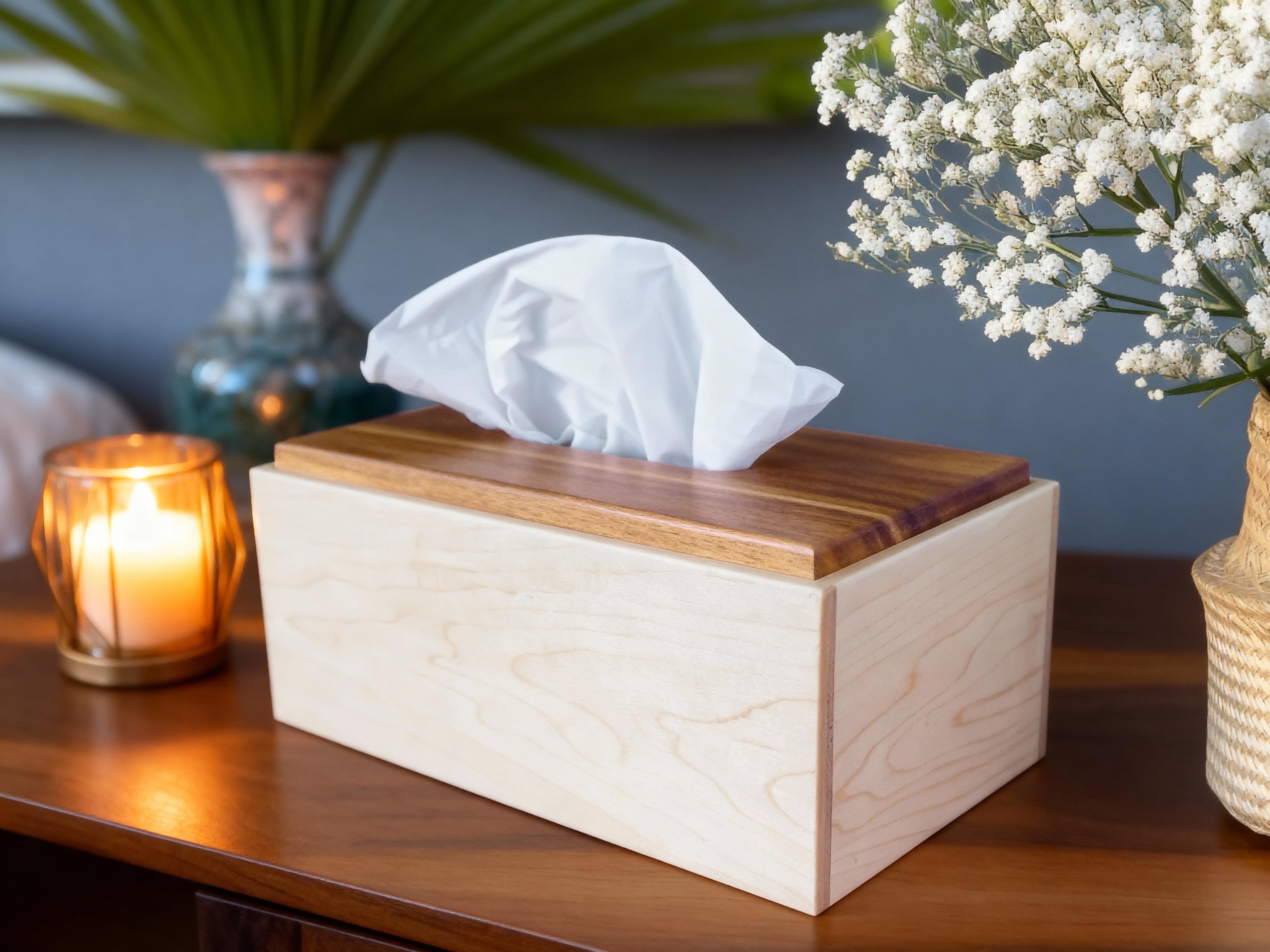 Functional and decorative, this solid wood tissue box will add a touch of modern elegance to any bedroom, kitchen, living room or office. The top is cedar and the sides are hard white maple.